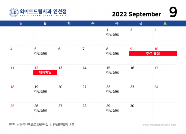 인천화이트드림 치과의 2022년 9월 진료 안내입니다!