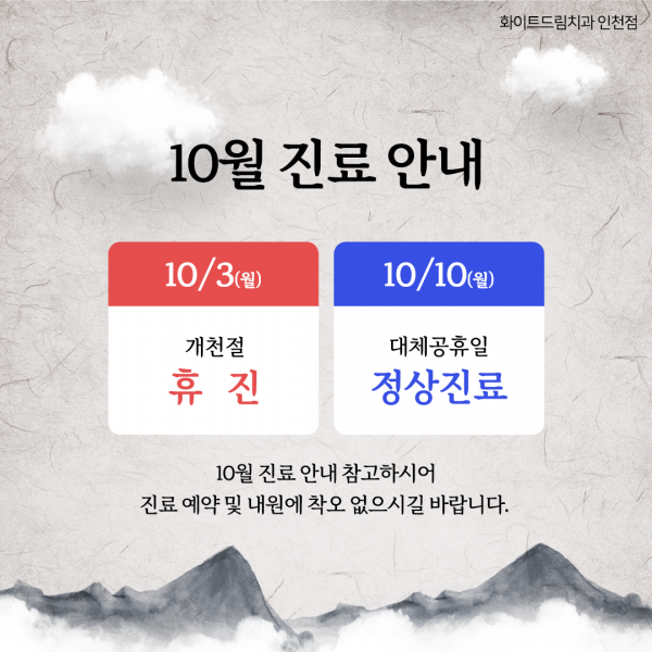 [휴진안내] 10월 휴진 일정 안내 페이지 정보 작성자 최고관리자 댓글 0건 조회 1,810회 작성일 22-09-27 15:15 본문 안녕하세요. 인천 화이트드림 치과입니다 :)10월 3일(월) 개천절은 휴진이며10월 10일(월) 한글날 대체공휴일은 정상진료입니다. 진료 예약 및 내원에 참고하시길 바랍니다. 감사합니다. 문의전화 : 032-219-2880카카오톡: 인천화이트드림치과 (클릭) 목록 이전글[진료안내]인천화이트드림 치과 10월 진료일정입니다. 22.09.27 다음글[휴진안내] 9월 휴진 일정 안내 22.08.30 댓글목록 댓글목록 등록된 댓글이 없습니다.