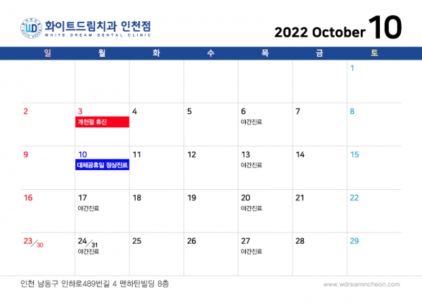 인천화이트드림 치과의 2022년 10월 진료 안내입니다!