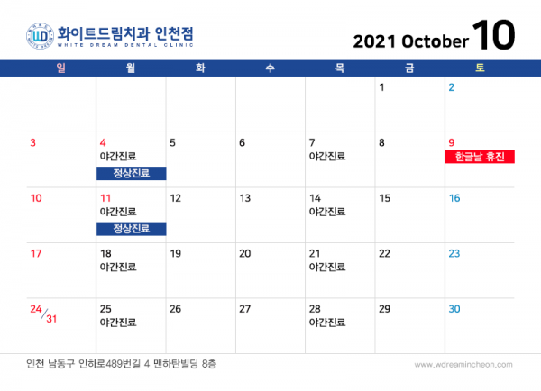 인천화이트드림 치과의 2021년 10월 진료 안내입니다!