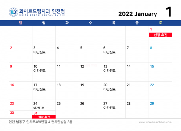 인천화이트드림 치과의 2022년 1월 진료 안내입니다!
