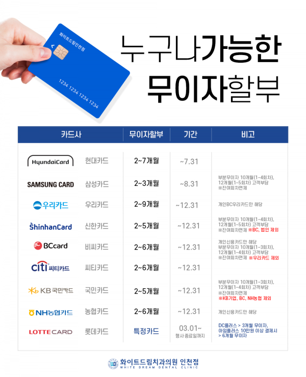 [무이자할부]화이트드림 인천점에서 누구나 가능한 무이자 할부 페이지 정보 작성자 최고관리자 댓글 0건 조회 2,699회 작성일 20-07-16 17:01 본문 목록 이전글[진료안내]인천화이트드림 치과 8월 진료일정입니다. 20.07.28 다음글[진료안내]인천화이트드림 치과 7월 진료일정입니다. 20.06.29 댓글목록 댓글목록 등록된 댓글이 없습니다.