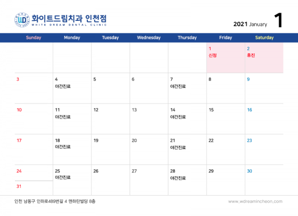 인천화이트드림 치과의 2021년 1월 진료 안내입니다!