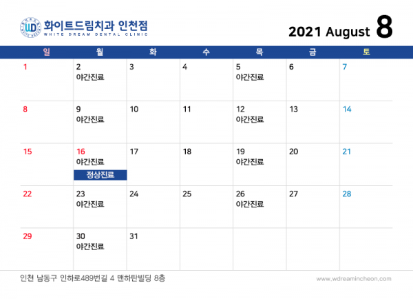 인천화이트드림 치과의 2021년 8월 진료 안내입니다!