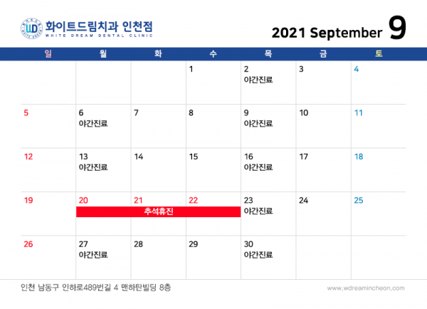 인천화이트드림 치과의 2021년 9월 진료 안내입니다!