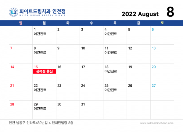 인천화이트드림 치과의 2022년 8월 진료 안내입니다!