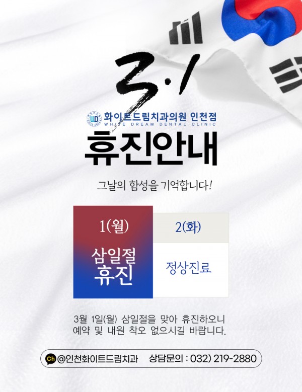 [휴진안내] 삼일절 휴진안내 페이지 정보 작성자 최고관리자 댓글 0건 조회 2,227회 작성일 21-02-18 14:16 본문 안녕하세요. 인천 화이트드림 치과입니다 :)3월 1일 (월) 삼일절 휴진3월 2일 (화) 정상 진료 입니다. 진료 예약 및 내원에 참고하시길 바랍니다. 감사합니다. 문의전화 : 032-219-2880카카오톡 : 인천화이트드림치과 (클릭) 목록 이전글[진료안내]인천화이트드림 치과 3월 진료일정입니다. 21.03.02 다음글[진료안내]인천화이트드림 치과 2월 진료일정입니다. 21.01.28 댓글목록 댓글목록 등록된 댓글이 없습니다.