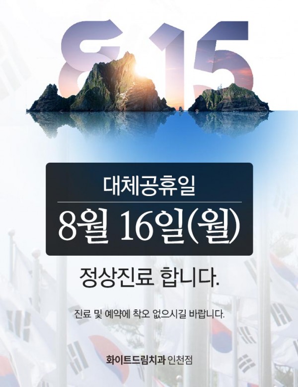 [정상진료안내] 광복절 대체휴일 정상진료 페이지 정보 작성자 최고관리자 댓글 0건 조회 1,975회 작성일 21-07-26 17:37 본문 안녕하세요. 인천 화이트드림 치과입니다 :) 8월 16일 (월) 광복절 대체휴일 정상진료합니다. 진료 예약 및 내원에 참고하시길 바랍니다. 감사합니다. 문의전화 : 032-219-2880카카오톡 : 인천화이트드림치과 (클릭) 목록 이전글[진료안내]인천화이트드림 치과 8월 진료일정입니다. 21.07.29 다음글[진료안내]인천화이트드림 치과 7월 진료일정입니다. 21.06.30 댓글목록 댓글목록 등록된 댓글이 없습니다.