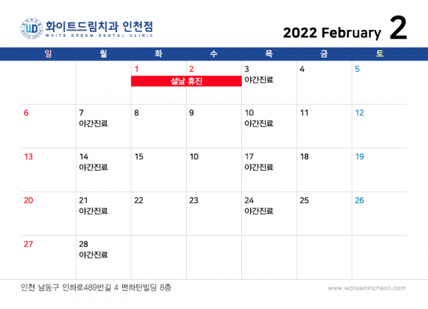 인천화이트드림 치과의 2022년 2월 진료 안내입니다!