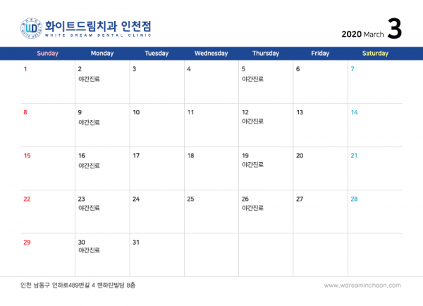 인천화이트드림 치과의 2020년 3월 진료 안내입니다!