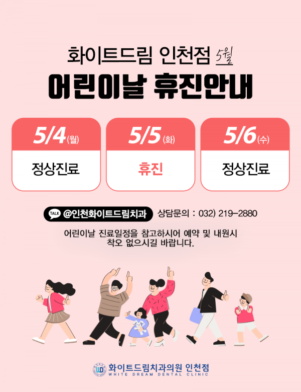 [휴진안내] 5월 어린이날 휴진 페이지 정보 작성자 최고관리자 댓글 0건 조회 2,131회 작성일 20-04-28 10:42 본문 안녕하세요. 인천화이트드림 치과입니다.2020년 5월 휴진에 대해 설명 드리겠습니다.5월 1일(금) 근로자의날 정상진료5월 5(화) 어린이날 휴진진료 예약 및 내원에 참고하시길 바랍니다. 감사합니다. 문의전화 : 032-219-2880카카오톡 : 인천화이트드림치과 (클릭) 목록 이전글[진료안내]인천화이트드림 치과 5월 진료일정입니다. 20.04.28 다음글[휴진안내] 4~5월 부처님오신날, 근로자의날 안내 20.04.17 댓글목록 댓글목록 등록된 댓글이 없습니다.