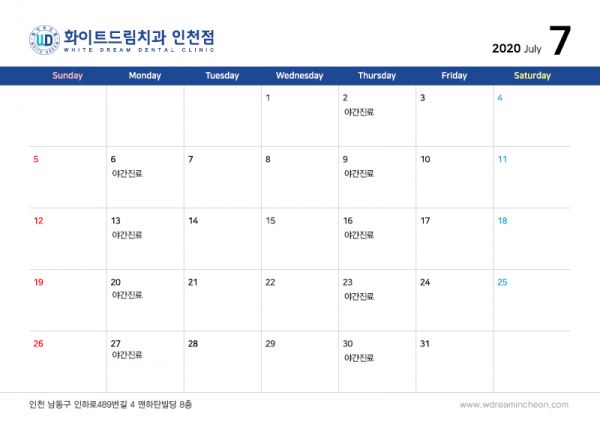 인천화이트드림 치과의 2020년 7월 진료 안내입니다!